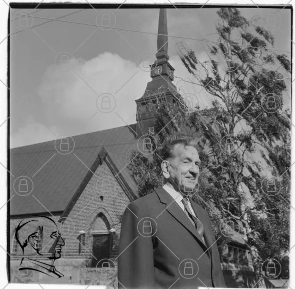 man, kyrka, byggnad, träd, himmel, moln, kostym, slips, svartvitt, porträtt, arkitektur, religion, historia, utomhus, landskap, gammal, tradition, samhälle, kultur, fotografi, 1900-tal