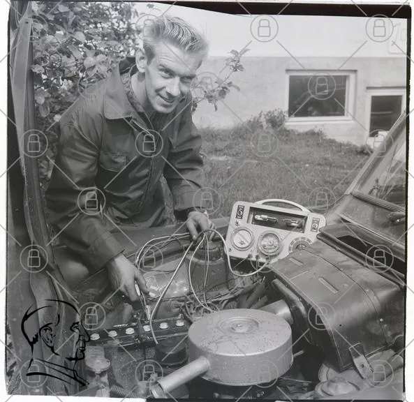 man, bil, motor, verktyg, teknik, reparation, 1960-tal, svartvitt, radio, mekaniker, mekanik, kabel, motorhuv, trädgård, utomhus, arbete, hantverk, vintage, bild, manuell, elektrisk, ljudsystem, fordon, motorarbete, professionell, leende, handarbete, mekanisk
