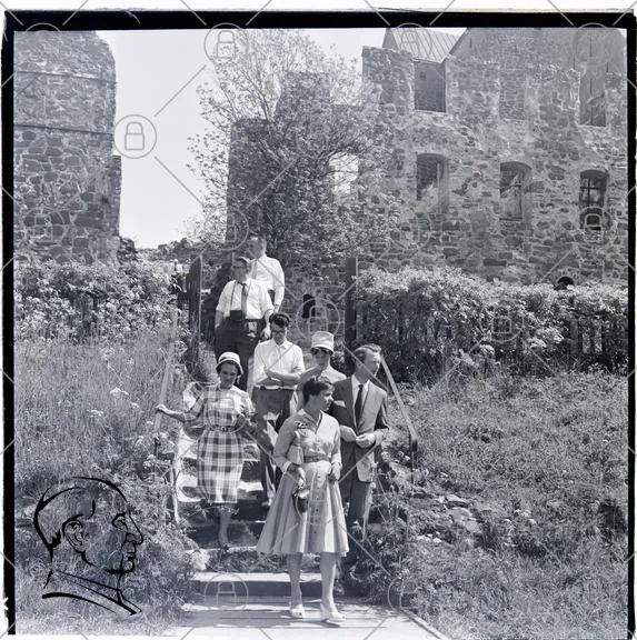 grupp, människor, trappa, kläder, historisk, byggnad, ruiner, blommor, sommar, fotografering, stil, 1950-tal, utomhus, promenad, landskap, klänning, kostym, hattar, leende, socialt, samling, tradition, kultur, natur, grönska, sten, arkitektur, familj, vänner