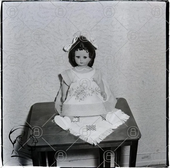 docka, klänning, bord, inredning, vintage, leksak, hår, snöre, tyg, mönster, svartvitt, hem, dekoration, barn, nostalgi, sitta, ansikte, ögon, leende, handsytt, retro, sängkläder, textil, stil, 1900-tal, samling, fotografi, porträtt, stilleben, konst