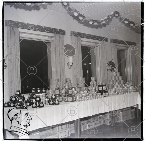 konservburkar, bord, fönster, gardiner, dekorationer, staplade burkar, Saško, svartvitt foto, inomhus, duk, produkter, förpackningar, stapling, varumärke, display, matvaror, retro, gammaldags, butik, utställning