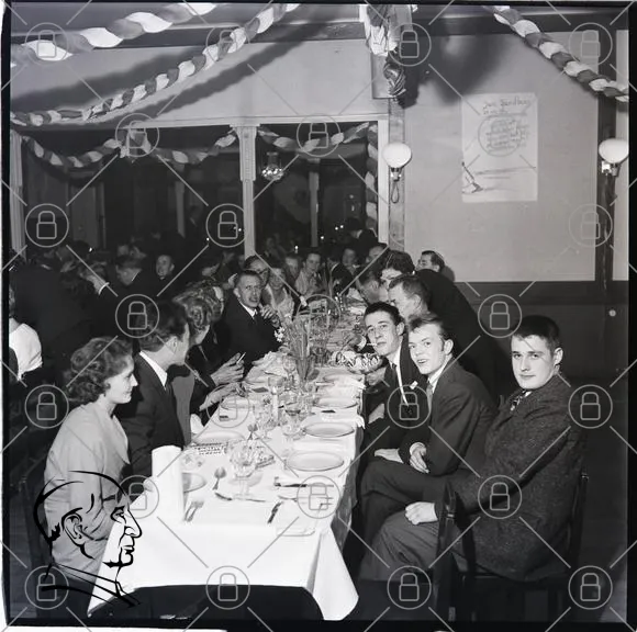 middag, fest, bord, gäster, dekorationer, servetter, glas, tallrikar, kläder, leenden, 1950-tal, samling, festlokal, belysning, blommor, stolar, samtal, festligheter, sällskap, mat, dryck, feststämning, tradition, socialt, gemenskap, festmåltid, festdukning, festlig, festbord, festkläder