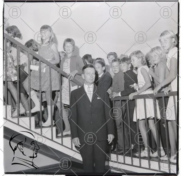 barn, trappa, kläder, pojkar, flickor, svartvitt, grupp, leende, 1960-tal, fest, skolaktivitet, vuxen, kostym, frisyrer, ungdomar, samling, fotografering, inomhus, socialt, glädje, tradition, stil, retro, gemenskap, skola, minnen, ungdom, klädkod, festligheter, ansikten