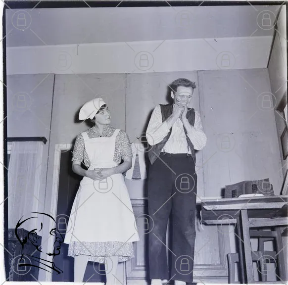 kvinna, man, kök, kläder, 1950-tal, förkläde, bord, stolar, inomhus, svartvitt, skåp, väggar, leende, gest, traditionell, scen, teater, interiör, vintage, uttryck
