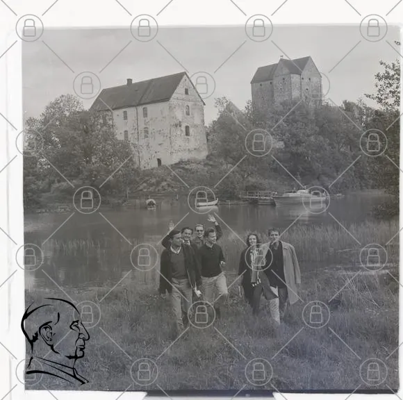 svartvit, grupp, människor, slott, byggnader, natur, vatten, träd, landskap, fotografering, utomhus, vänner, historia, gammal, arkitektur, sjö, sommar, glädje, samvaro, kultur