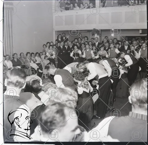 dans, fest, publik, kläder, 1930-tal, svartvitt, underhållning, män, kvinnor, leenden, samling, evenemang, tradition, socialt, glädje, musik, dansare, stämning, åskådare, kultur, historisk, gemenskap, aktivitet, festligheter, klädkod, uppträdande, interaktion, skratt, minnen, nostalgisk