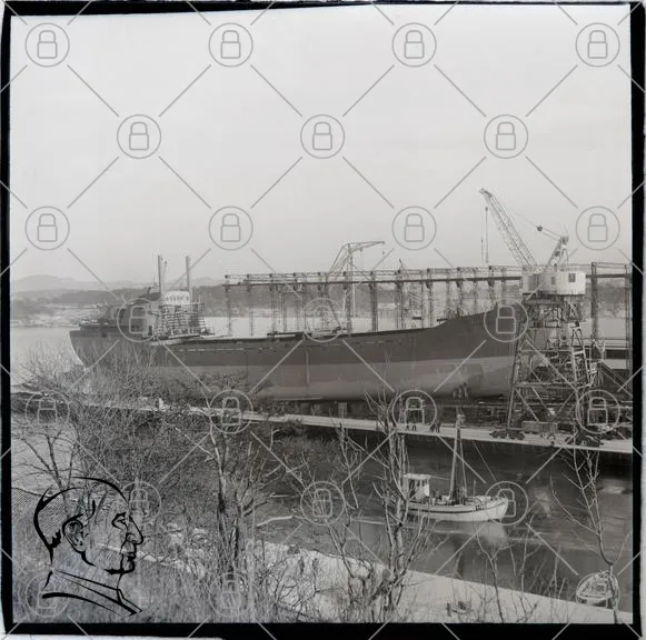 fartyg, skepp, varv, byggnation, industri, trä, vatten, kranar, båt, hamn, träd, svartvitt, konstruktion, lastfartyg, docka, arbetsplats