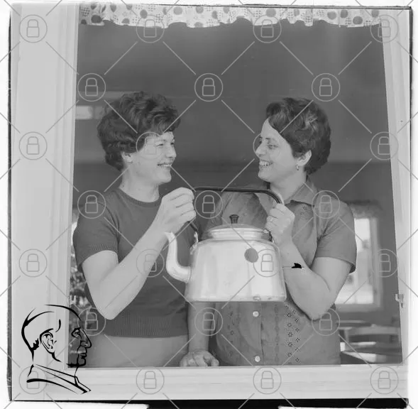 fönster, kvinnor, te, kaffekanna, leende, interaktion, svartvitt, retro, vänskap, hem, kök, tradition, gemenskap, glädje, vardag, samtal, socialt, nostalgiskt, 1960-tal, hemtrevligt, familj
