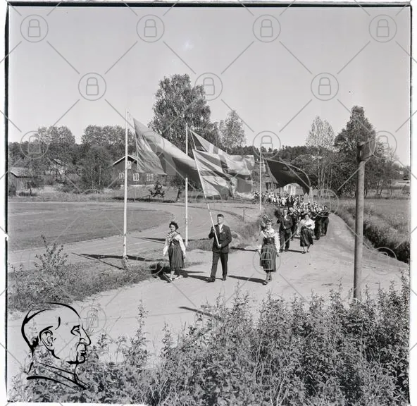 parad, flaggor, människor, traditionella kläder, landsbygd, träd, byggnader, fest, samling, kultur, historisk, svartvitt, procession, gemenskap, firande, nationaliteter, festligheter, folkloristisk, glädje, gemensamhet