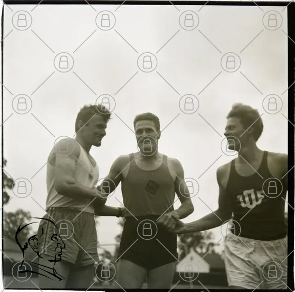 idrott, sport, män, träning, samarbete, vänskap, tävling, gymnastik, utomhus, 1900-tal, svartvitt, leende, handskakning, atletisk, laganda, motion, kropp, styrka, glädje, gemenskap