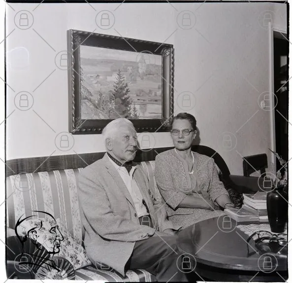 gammal man, kvinna, soffa, inomhus, svartvitt, porträtt, möbler, väggkonst, bord, böcker, glas, växt, kläder, ansiktsuttryck, interiör, familj, generationer, tradition, samtal, historia, nostalgi