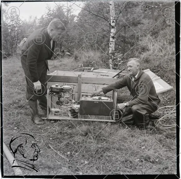 män, maskiner, utrustning, skog, teknik, arbete, verktyg, låda, generator, el, natur, 1900-tal, svartvitt, foto, landskap, installation, forskning, projekt, hantverk, industri, mänsklig aktivitet, utomhus, samarbete, tradition, historia, mekanik, kablar, box, motor, jord