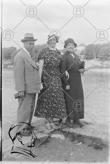 historisk, svartvit, foto, tre personer, kläder, hattar, sjö, strand, 1930-tal, familj, sommar, stil, porträtt, gammal, minnen, natur, landskap, vattnet, klippor, leende, vänskap, tradition, tidsepok, mode, fotografering, nostalgi, utomhus, samling, människor, kultur