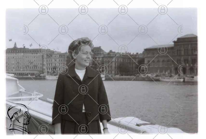 kvinna, båt, vatten, stad, byggnader, svartvit, kläder, leende, hamn, himmel, 1900-tal, porträtt, resa, fotografi, landskap, kultur, historia, mode, natur, turism
