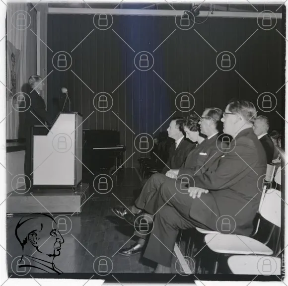 talare, publik, föreläsning, konferens, svartvit, klädd, kostym, podium, mikrofon, sittande, män, kvinnor, evenemang, lokal, piano, belysning, åhörare, presentation, tal, samling, formell, diskussion, 1960-tal, professionell, inomhus, ålder, stil, arrangemang, uppträdande, åsikter