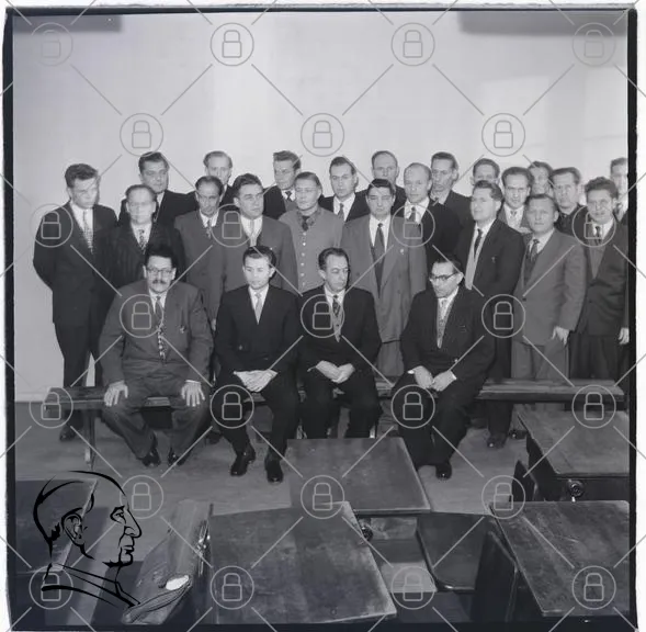 grupp, män, kostymer, svartvitt, fotografi, klassrum, bänkar, 1950-tal, formella kläder, samling, porträtt, professionella, utbildning, män i kostym, traditionell, stil, ansikten, leenden, bakgrund, inomhus, historia, samhälle, samarbete, gruppfoto, mänsklig interaktion, tidsepok, socialt sammanhang, gemenskap, representation