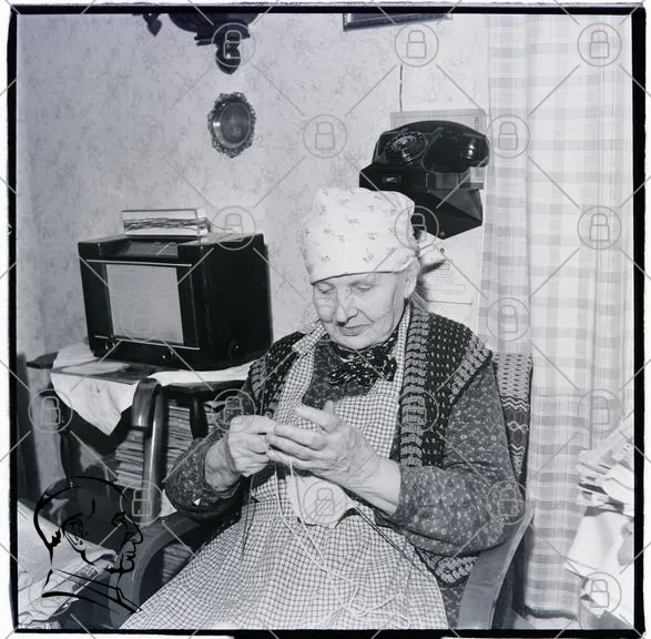 gammal kvinna, svartvit bild, sittande, telefon, gammal radio, hem, inredning, kläder, huvudduk, handarbete, möbler, väggdekoration, fönster, bord, tidningar, traditionell, nostalgi, vintage, kultur, livsstil