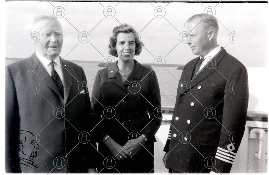 personer, båt, hav, svartvit, kläder, kostymer, leende, porträtt, sjö, utsikt, 1900-tal, gruppbild, man, kvinna, marin, kapten, stil, formell, resande, historia