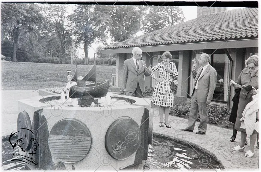brunn, fontän, människor, trädgård, svartvit, klänning, kostym, barn, båt, samtal, sommar, utomhus, staty, glas, cigarett, byggnad, gräs, stil, 1900-tal, socialt, samvaro