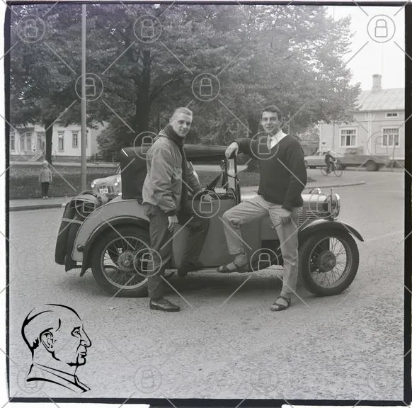 bil, män, vintage, svartvit, gata, träd, kläder, 1900-tal, fordon, parkering, leende, fotografering, stadsbild, retro, två personer, kortbyxor, jacka, skor, landskap, historisk, gammal, motor, hjul, asfalt, byggnader, stil, kultur, tidsepok, vänskap, nostalgi