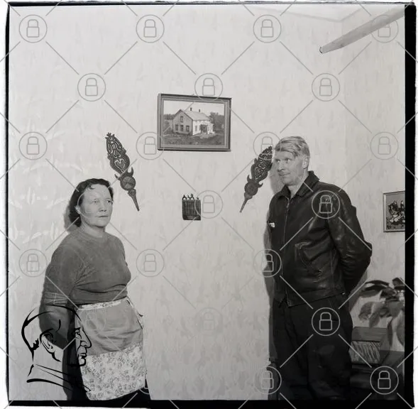 kvinna, man, inomhus, svartvitt, fotografi, vägg, tavla, kläder, förkläde, möbler, 1900-tal, porträtt, traditionell, hem, interiör, ansiktsuttryck, stil, kultur, historia, gammal, par, rum, dekoration, väggprydnad, naturmotiv, fotografi