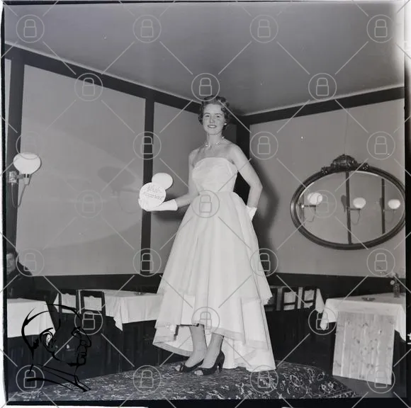 modell, klänning, mode, catwalk, 1950-tal, svartvitt, fotografi, fest, elegans, stil, restaurang, spegel, belysning, publik, skönhet, vintage, evenemang, kvinna, handväska, skor