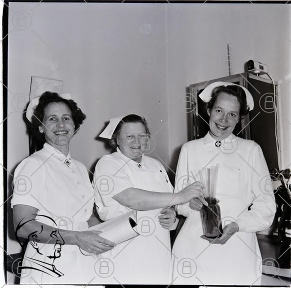 sjuksköterskor, vit uniform, sjukhus, 1950-tal, historisk bild, medicinsk personal, leende, vård, kvinnliga sjuksköterskor, vårdpersonal, fotografi, svartvitt, traditionell klädsel, sjukvård, professionell, teamwork, hälsa, medicin, vårdande, omsorg