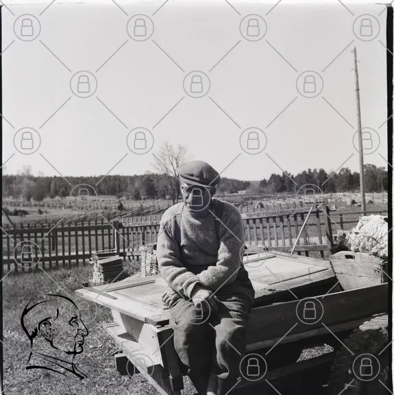 man, skog, fält, trä, vagn, gammal, landskap, jordbruk, hatt, sittande, svartvitt, natur, sommar, traditionell, verktyg, staket, fäbod, historia, rural, arbete