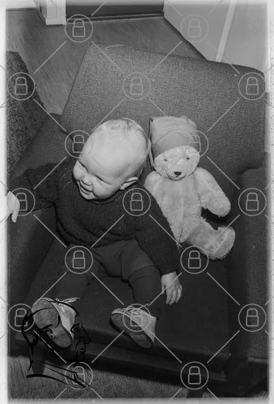barn, leksak, nalle, soffa, svartvitt, skratt, kläder, sittande, inomhus, säng, mjukisdjur, baby, leende, kram, mysigt, huvudbonad, strumpor, foton, nostalgi, familj, barndom, söt, gosig, lek, trygghet, minnen, gammal, retro, gullig, barnkläder