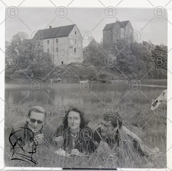 svartvit, foto, människor, landskap, slott, byggnader, vatten, gräs, träd, 1970-tal, retro, natur, grupp, vänner, avslappnat, historia, gammal, kultur, tradition, sommar, picknick, djur, ko, reflektion, stillhet, nostalgi, utomhus, fotografering, konst