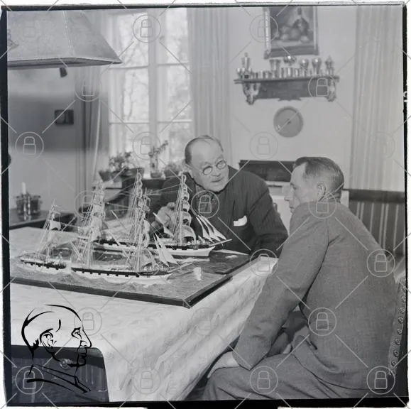 modellbåtar, segelbåtar, hantverk, trä, bord, män, inomhus, samtal, detaljer, heminredning, fönster, skala, sjöfart, historia, konst, hobby, 1900-tal, fotografi, svartvitt, tradition