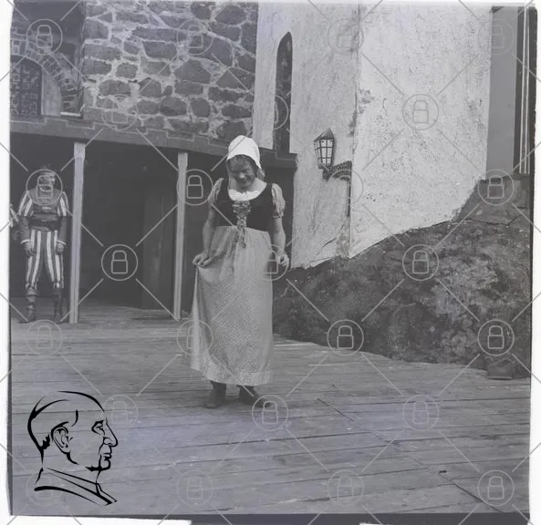 historisk, kläder, kvinna, man, traditionell, kostym, scen, teater, svartvitt, gammal, folkloristisk, kultur, 1900-tal, klädd, utomhus, byggnad, trä, sten, hatt, skådespelare, folklor, kostymteater, historiskt, uppträdande, landsbygd, svensk, gammaldags, stil, rekvisita, fotografering
