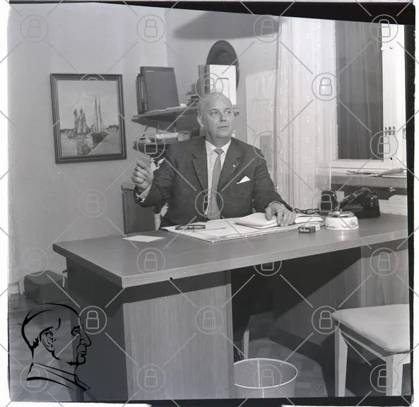 man, kontor, skrivbord, dokument, telefon, kostym, slips, möbler, fönster, tavla, papperskorg, svartvitt, affärsmann, inredning, 1900-tal, professionell, arbetsmiljö, kontorsutrustning, gest, fokus, stil