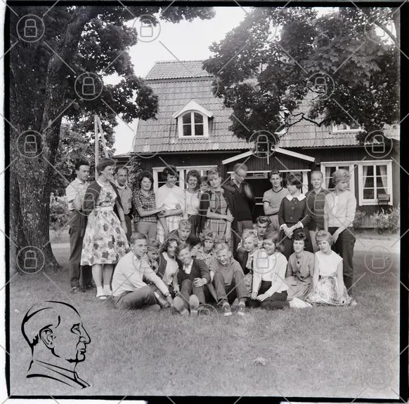 grupp, barn, ungdomar, skola, sommar, träd, hus, fotografi, svartvitt, kläder, leende, samling, 1950-tal, utomhus, landskap, tradition, minnen, vänskap, glädje, natur, gemenskap, familj, historia, lek, fritid, fotografering, kultur, nostalgi, skandinavisk, gemensamhet