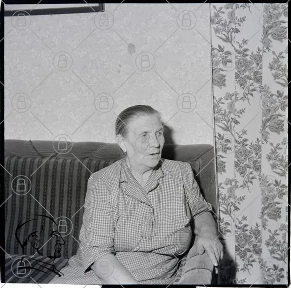 gammal kvinna, soffa, inomhus, svartvitt, klänning, mönster, ansikte, heminredning, blommor, fotografi, äldre, sittande, uttryck, familj, tradition, nostalgi, vintage, rum, textil, interiör, kultur, historia, generationer, minnen, livserfarenhet, hem, komfort, sällskap, värme, kärlek