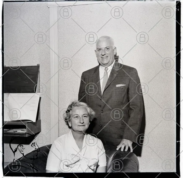 man, kvinna, kostym, klänning, porträtt, svartvitt, interiör, sittande, stående, äldre, leende, formell, kontor, möbler, dokument, vägg, frisyr, slips, kavaj, skjorta
