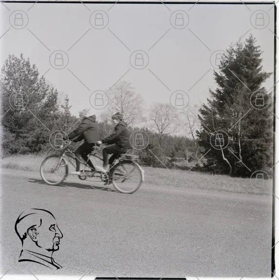 cykel, tandemcykel, män, skog, landskap, svartvitt, vintage, natur, väg, träd, cykling, utomhus, motion, vänner, gammaldags, transport, fritid, sommar, landsbygden, fotografering