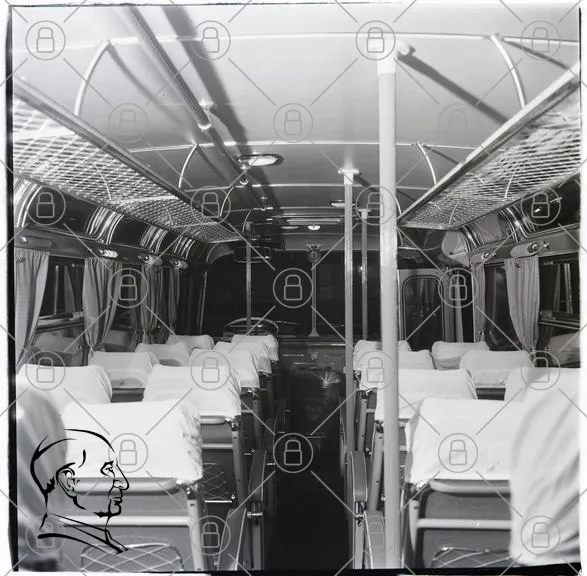 buss, interiör, säten, tom, svartvit, fönster, tak, belysning, gardiner, rader, transport, kollektivtrafik, sittplatser, stolar, bussförare, ratt, utrymme, design, retro, vintage, resande, komfort, inredning, linjer, struktur, detaljer, miljö, atmosfär, modernisering, funktionalitet