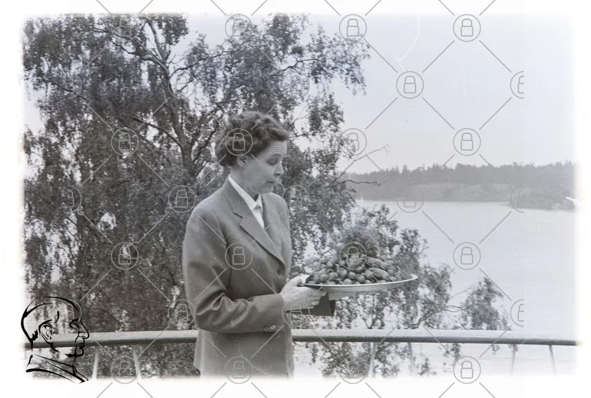kvinna, tallrik, grönsaker, sjö, träd, svartvitt, klänning, 1940-tal, natur, porträtt, mat, utomhus, vintage, stil, landskap, hand, skål, traditionell, sommar, fotografering, bakgrund, frukt, bär, skörd, svensk, kvinna i kostym, gammal bild, historisk, stillhet