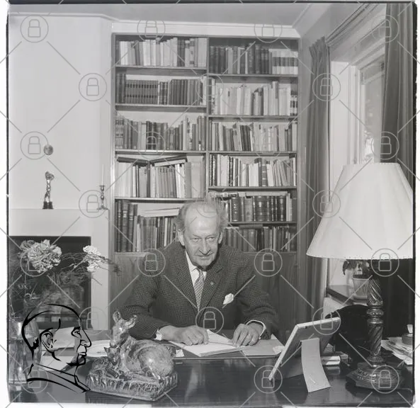 man, skrivbord, böcker, bibliotek, lampa, blommor, dokument, skrivande, inomhus, svartvitt, kontor, möbler, statyett, fönster, papper, penna, gammaldags, stil, intellektuell, fokus, arbete, studier, litteratur, klassisk, professionell, seriös, porträtt, miljö, heminredning, traditionell