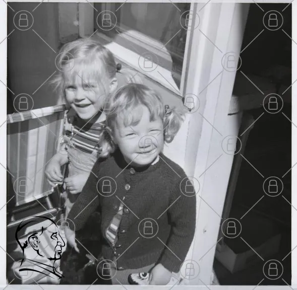 barn, leende, utomhus, svartvitt, kläder, flickor, leksak, soligt, sommar, vänskap, glädje, hår, pigtails, tröja, byxor, fönster, veranda, fotografering, nostalgi, barndom, lek