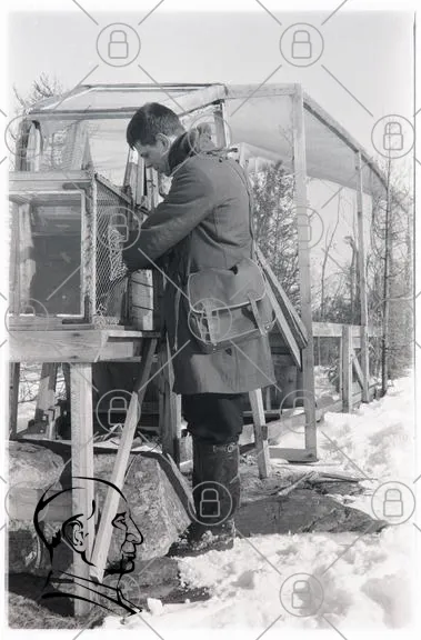 man, fångst, burar, vinter, snö, kläder, ryggsäck, trä, natur, utomhus, arbete, fotografi, svartvitt, landskap, djur, forskning, miljö, tradition, hantverk, människa