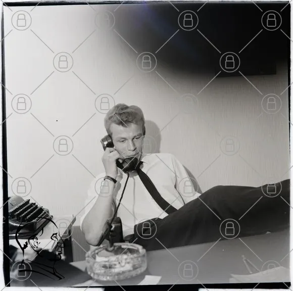 man, telefon, kontor, svartvitt, 1960-tal, skrivbord, slips, cigarett, telefonlur, avslappnad, arbetsmiljö, retro, affärsmann, inomhus, kommunikation, vintage, professionell, arbetskläder, kontorsutrustning, ansiktsuttryck, fokus