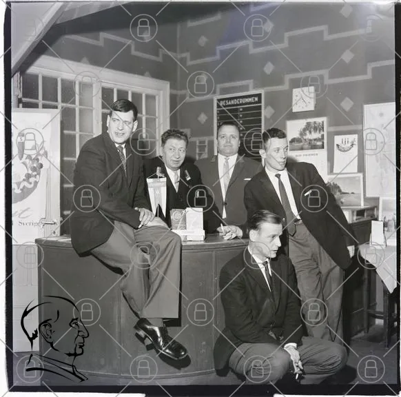 män, kostymer, 1950-tal, svartvitt, kontor, möte, affärsmän, stående, sittande, inredning, dokument, priser, dekoration, väggar, bord, fotografi, gruppbild, stil, tradition, historia, samarbete, presentation, evenemang, socialt, professionellt, kläder, stilfullt, interiör, reklam, organisation