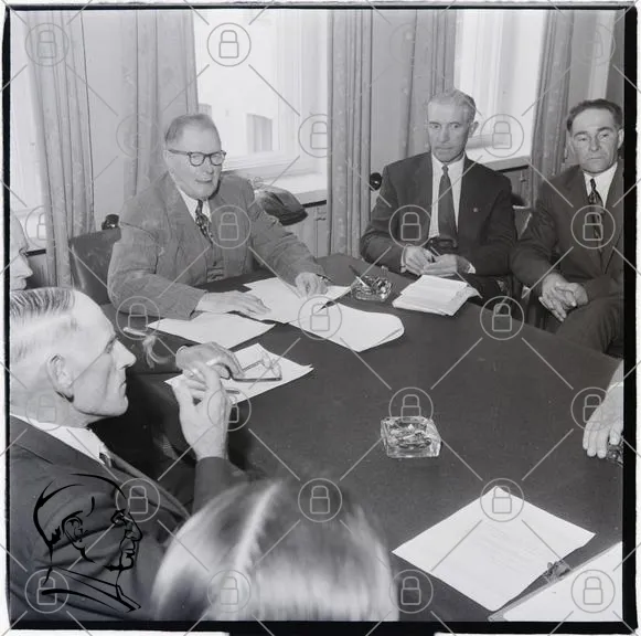 möte, män, bord, dokument, anteckningar, glas, fönster, kostymer, 1940-tal, diskussion, affärsmän, skrivbord, papper, cigarett, kontor, formell, grupp, ledarskap, samarbete, professionell