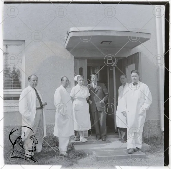 läkare, sjuksköterska, medicin, sjukhus, 1950-tal, vit rock, gruppfoto, entré, byggnad, professionell, svartvitt, historisk, personal, vård, medicinsk, traditionell, uniform, leende, män, kvinnor, samarbete, hälsa, medicinsk personal, klinik, forskning, medicinsk historia, vårdpersonal, medicinska yrken, samhälle, medicinsk utbildning