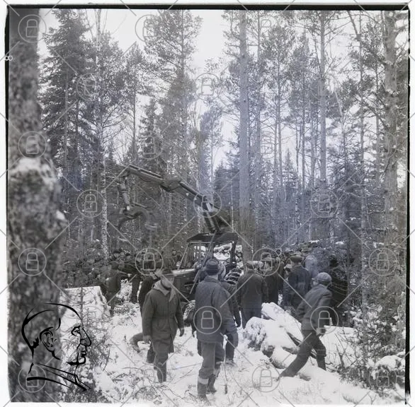 skog, vinter, människor, maskin, trädfällning, snö, träd, arbete, skogsbruk, natur, industri, grupp, verktyg, landskap, traditionell, utomhus, rörelse, skogsmaskin, historisk, samarbete, miljö, tystnad, kallt, kläder, skogsarbetare, aktivitet, foton, svartvitt, gammal
