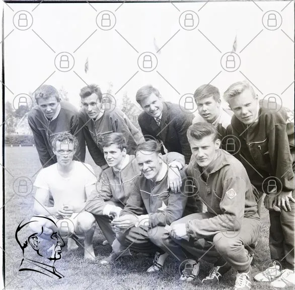 grupp, män, sport, idrott, löpning, tävling, kläder, svartvitt, ungdomar, leende, utomhus, träning, gemenskap, 1960-tal, prestation, lag, vänner, motion, samarbete, tradition, glädje, energi, fokus, samling, fotografering, minnen, nostalgi, ungdomlig, aktivitet, prestationer