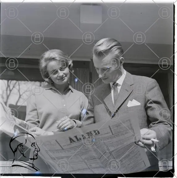 kvinna, man, tidning, Aland, svartvitt, 1950-tal, läsning, utomhus, kläder, ansiktsuttryck, interaktion, fotografi, retro, stil, information, nyheter, dokument, papper, samtal, kultur, historia, par, leende, intresse, fokus, miljö, arkitektur, fönster