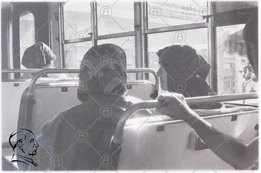 buss, passagerare, kvinnor, huvudduk, sittplatser, fönster, svartvitt, inomhus, transport, stad, kläder, hand, ansikte, bakgrund, resande, traditionell, kultur, gemenskap, äldre, interiör, offentlig, miljö, vardag, samvaro, rörelse, livsstil, samhälle, historia, nostalgi, fotografi